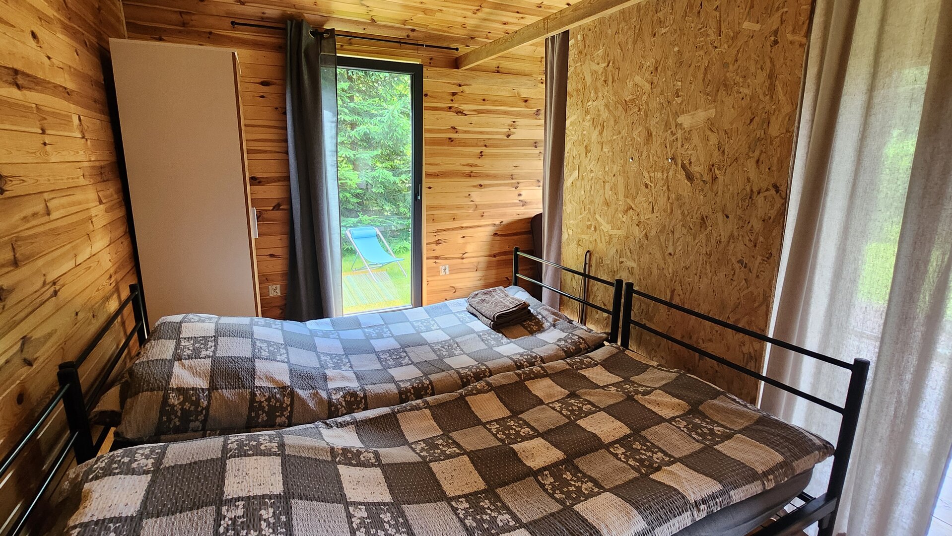 Na zewnątrz domku znajdują się leżaki lub krzesła ogrodowe oraz mały grill.