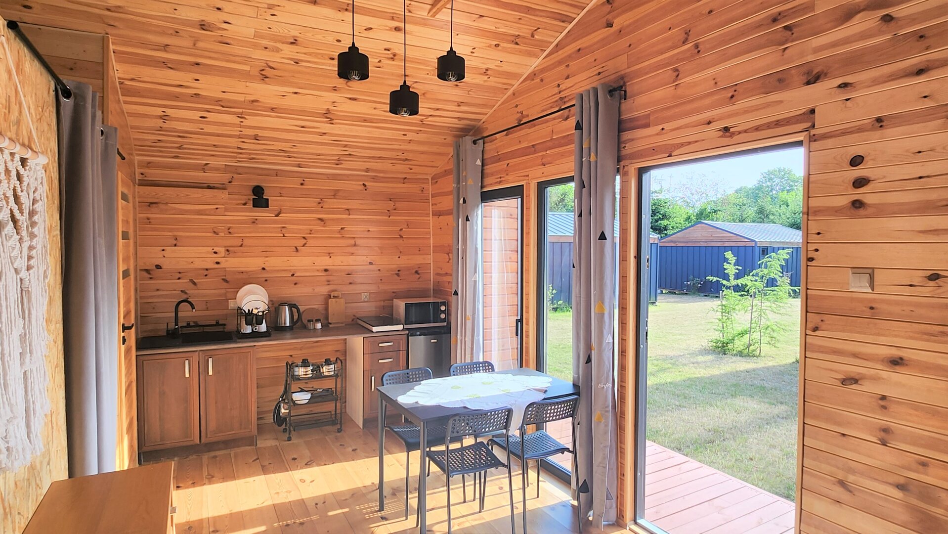 Na zewnątrz domku znajdują się leżaki lub krzesła ogrodowe oraz mały grill.