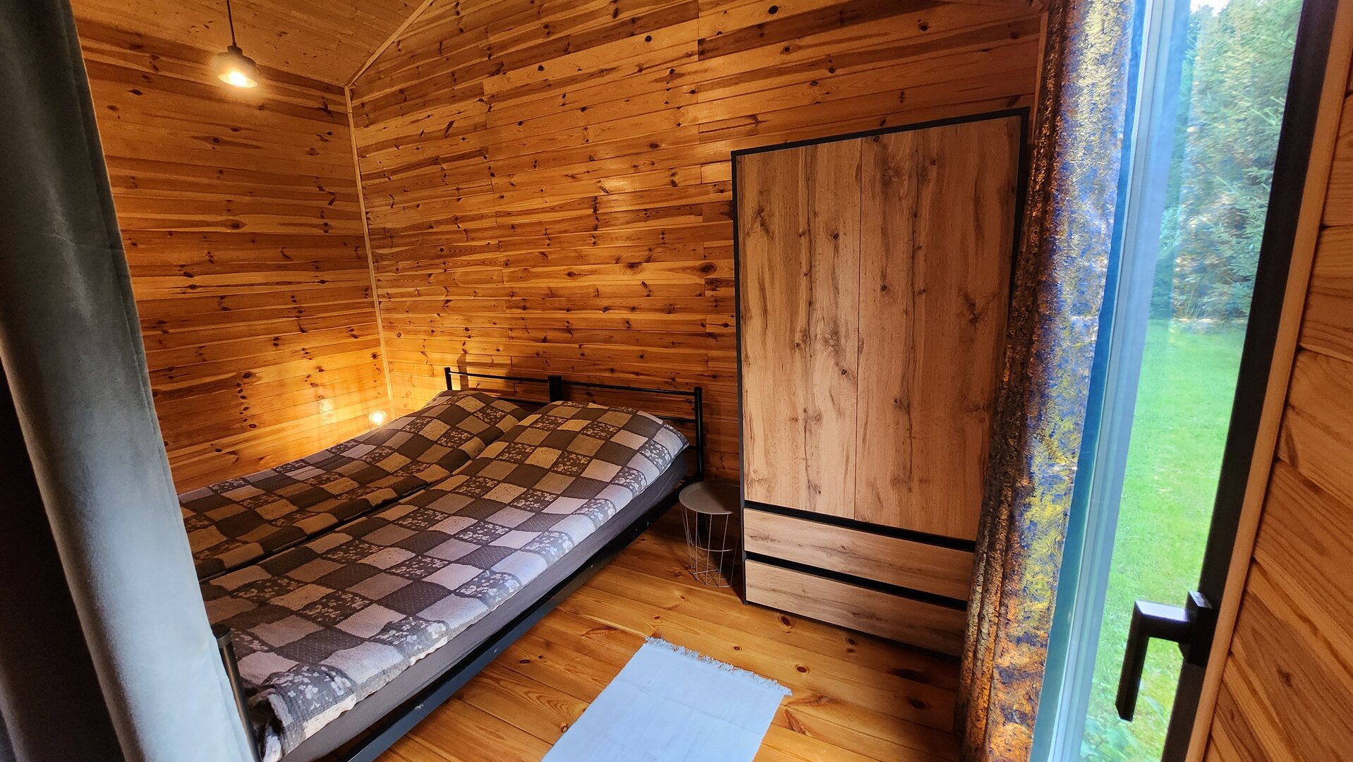 Domek wyposażony jest w 4 miejsca noclegowe. Dwa łóżka pojedyncze znajdują sie w części sypialnej, natomiast w części dziennej stoi rokładana, dwuosobowa kanapa. Pomieszczenia oddzielone są od siebie ścianką i zasłonami. Z każdego z nich można wyjść na zewnątrz. Poza tym na wyposażeniu domku znajdują się: stół z krzesłami, szafa, komoda, telewizor, lustro, ręczniki. Aneks kuchenny posiada  niezbędne naczynia i akcesoria. Łazienka wyposażona została w wc, umywalkę i kabinę natryskową.