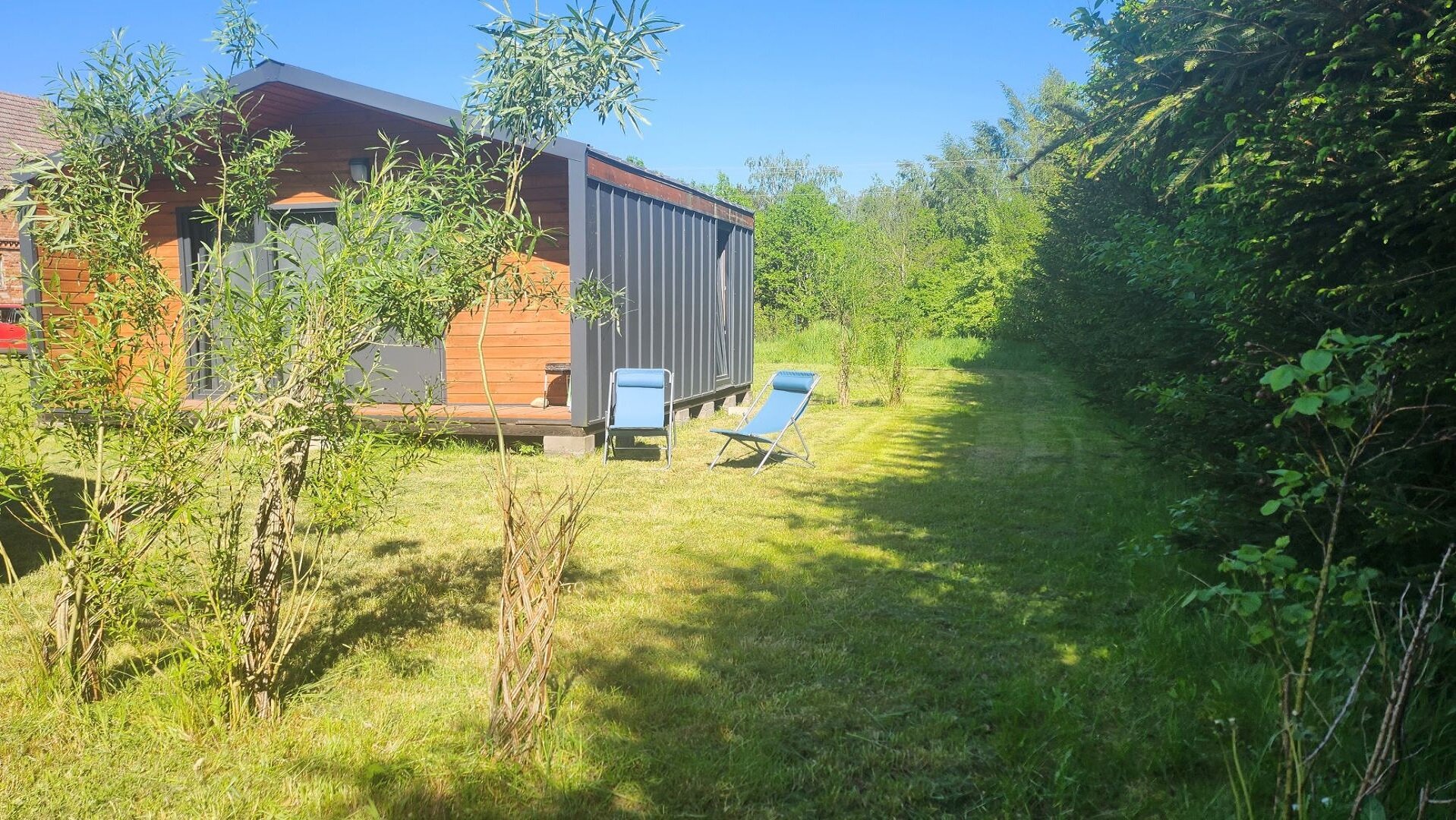 Przy domku znajdują się leżaki i mały grill.
