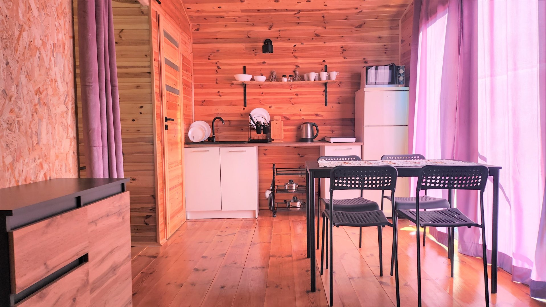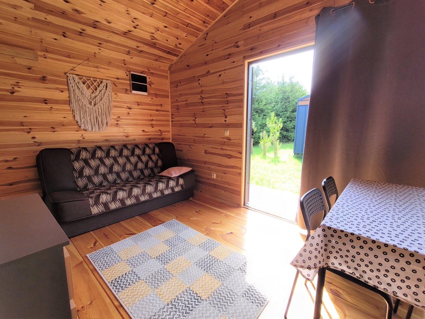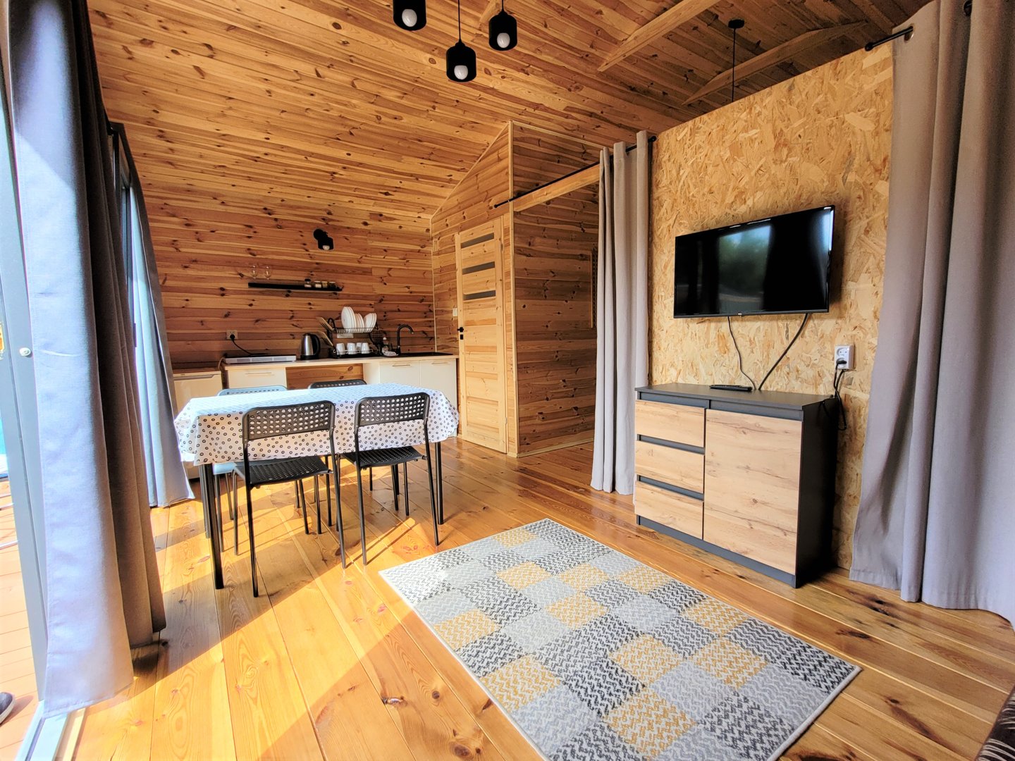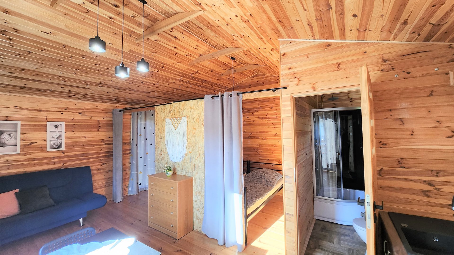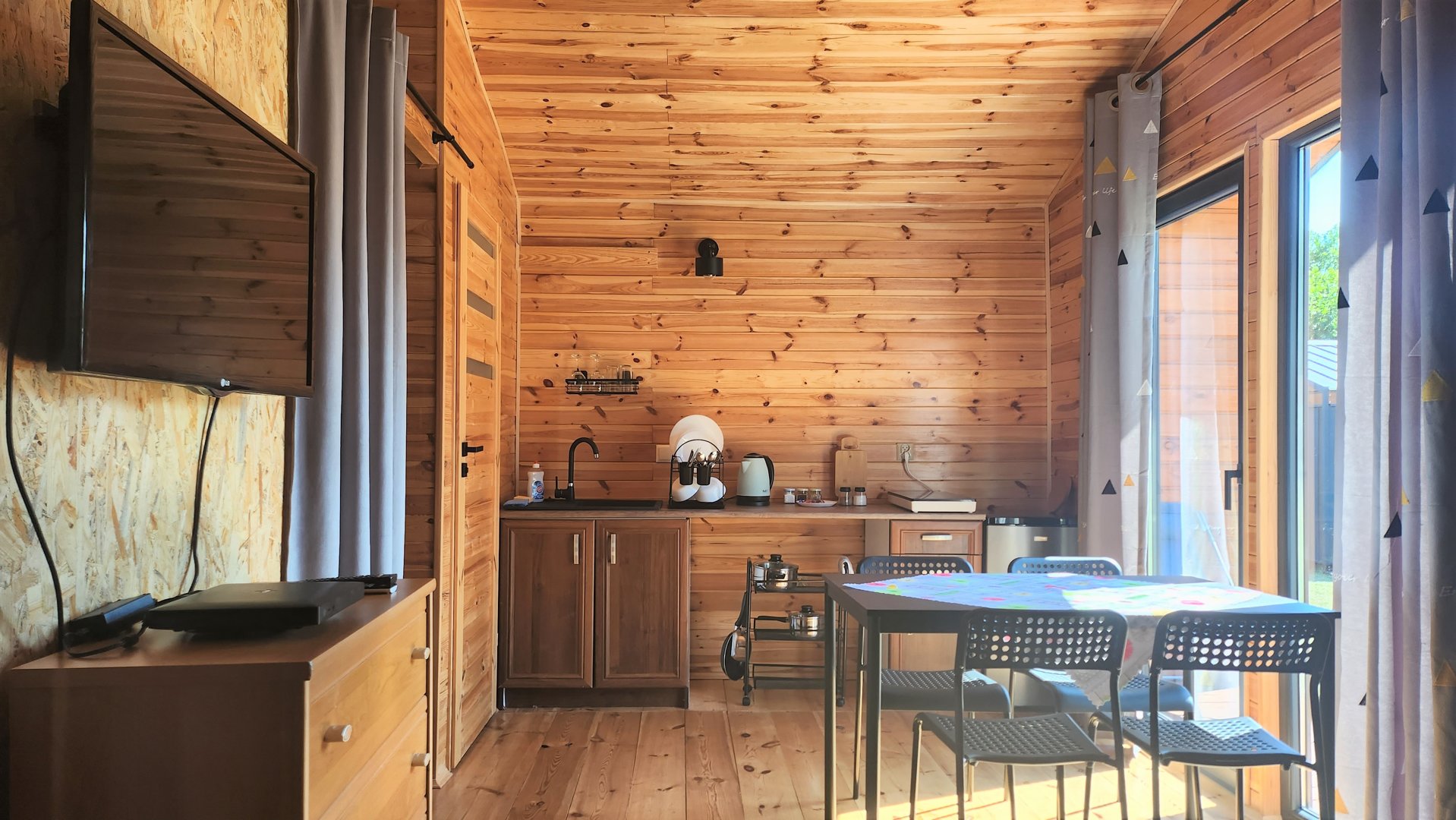 Domek posiada powierzchnię 35 metrów kwadratowych, na której znajduje się taras, przestrzeń dzienna, cżęść sypialna, aneks kuchenny i łazienka.